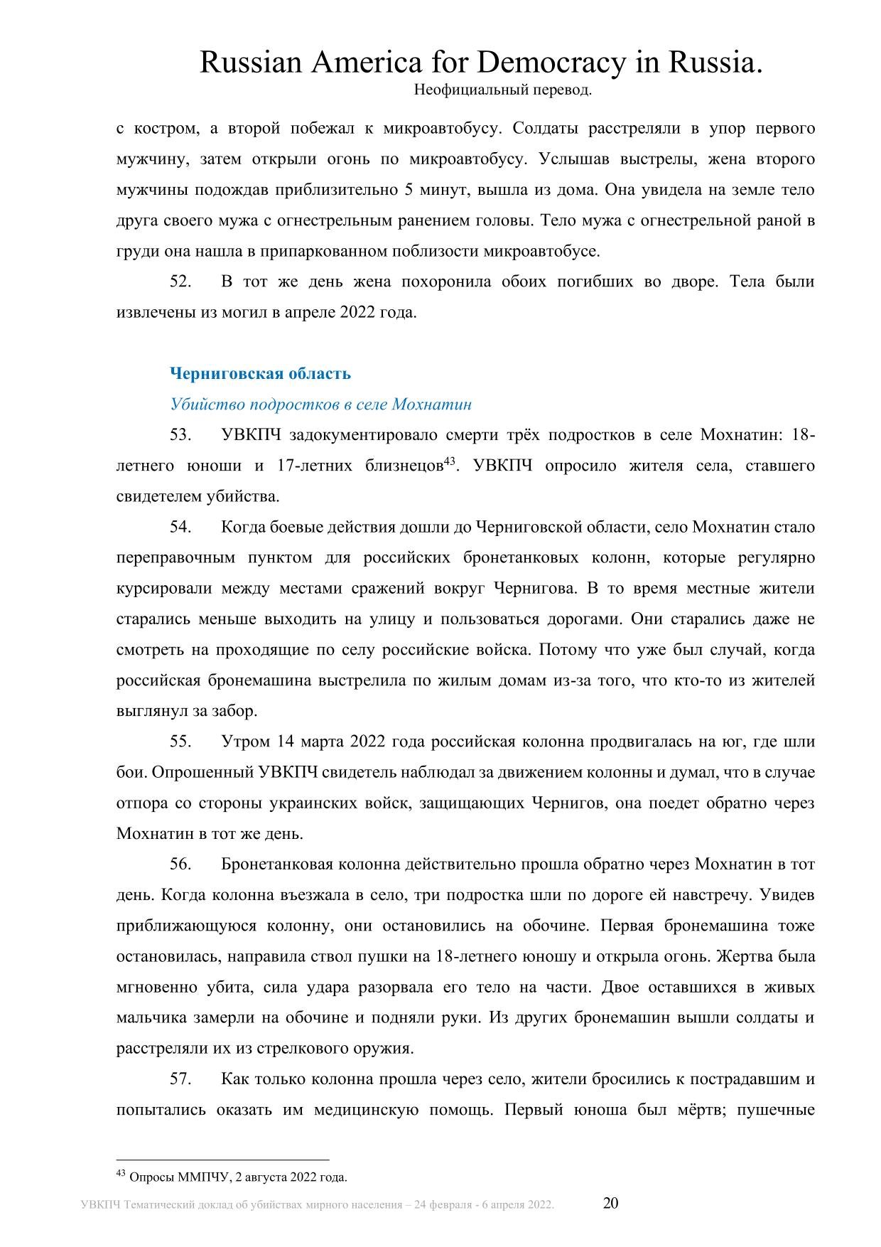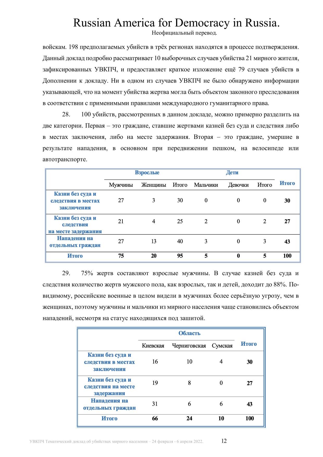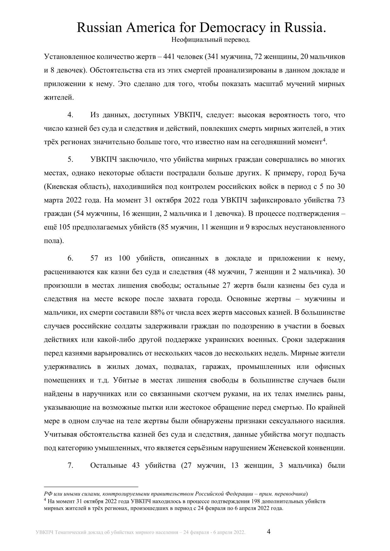 ООН задокументировала 441 убийство мирных жителей в период с 24 февраля по 6 апреля 2022 года на оккупированных территориях Украины. Среди убитых — 28 детей. В докладе подчеркивается, что реальное число смертей, вероятно, значительно выше.