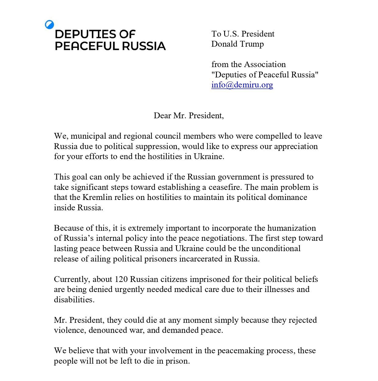 Мы, российские депутаты, вынужденно покинувшие Россию из-за политических преследований, глубоко признательны Вам за Ваше стремление остановить войну. Главный этап на этом пути – стимулировать российское руководство сделать реальные значимые шаги для прекращения военных действий. Но оно использует военные действия для того, чтобы укреплять власть внутри страны.