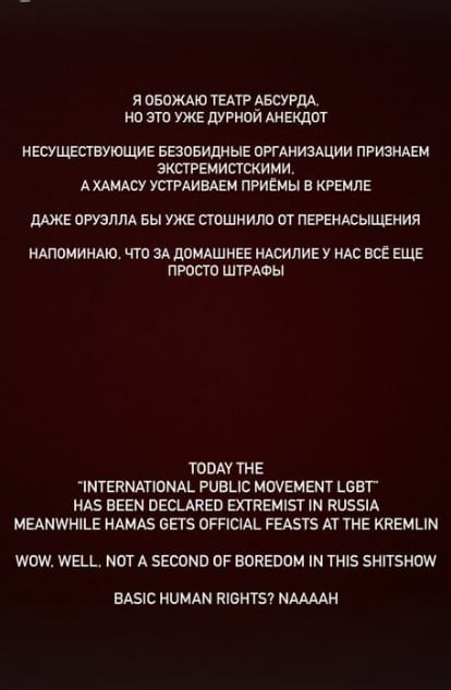 “Я обожаю театр абсурда, но это уже дурной анекдот. Несуществующие безобидные организации признаем экстремистскими, а ХАМАСу устраиваем приемы в Кремле. Даже Оруэлла бы уже стошнило от перенасыщения. Напоминаю, что за домашнее насилие у нас все еще просто штрафы”, — написала в соцсетях Екатерина Соловьева, на публикацию обратила внимание “Верстка”.
