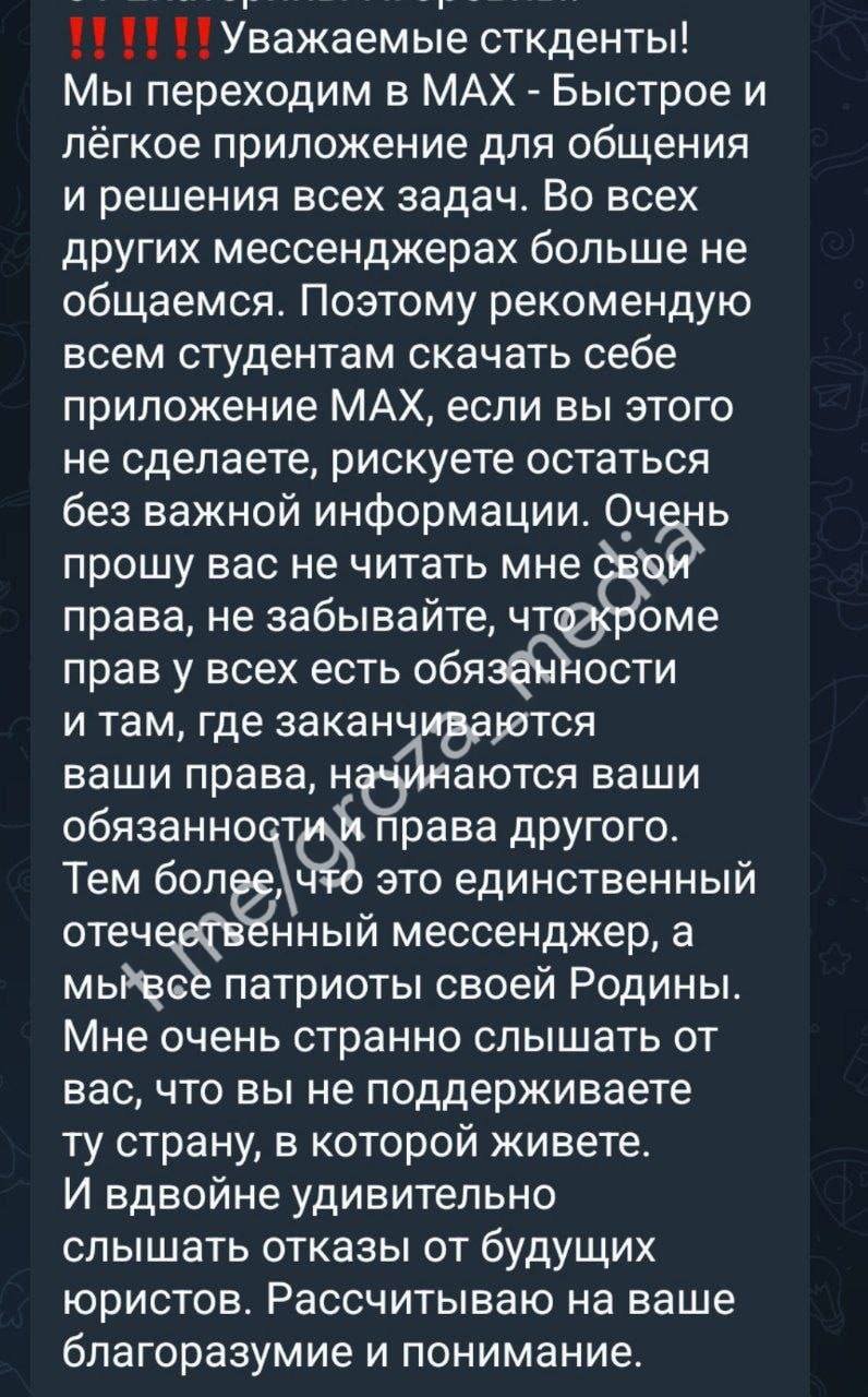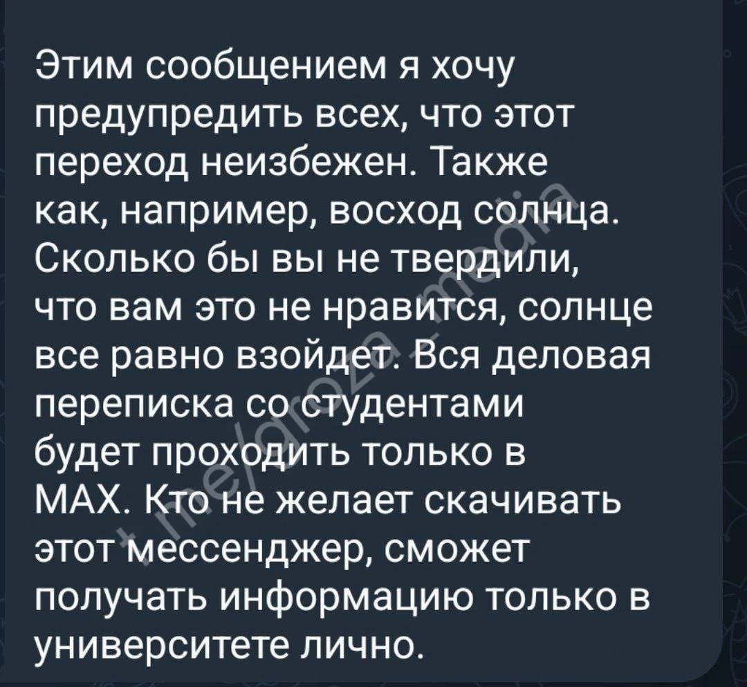 Как сообщает телеграм-канал «Гроза», руководство Новороссийского филиала КубГУ разослало старостам групп требования установить Max. Применение мессенджера в этих сообщениях названо «неизбежным, как восход солнца», а отказавшимся пригрозили, что они всю необходимую информацию смогут получать только лично.