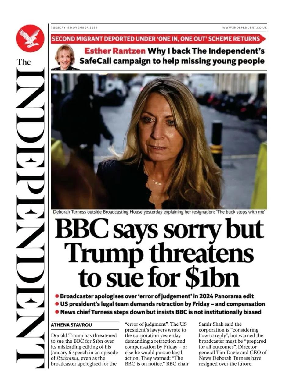 «BBC извинилась, но Трамп угрожает подать в суд на 1 миллиард долларов» — обложка британской газеты The Independent