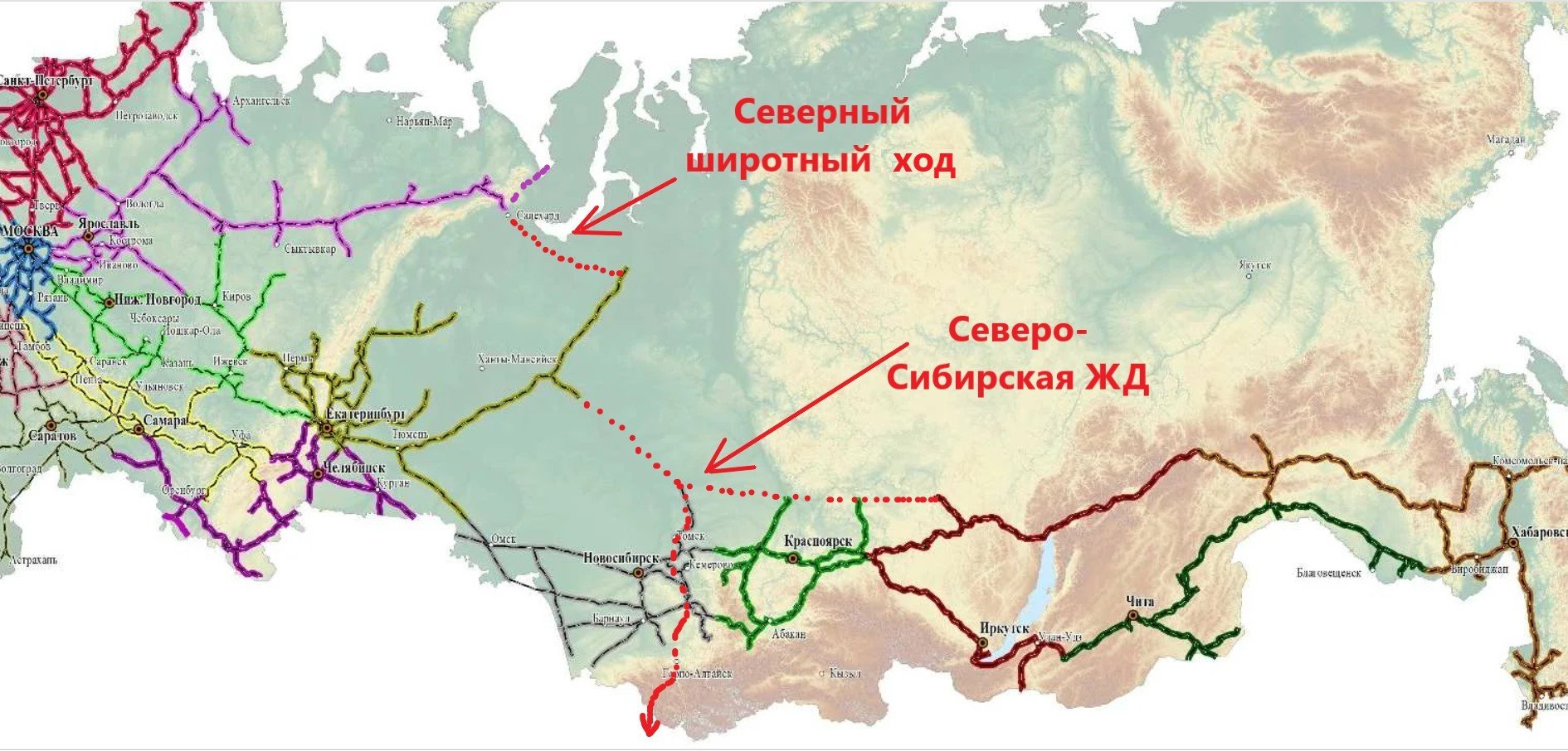 Так, чтобы насытить «Северный морской путь» не китайскими, а российскими грузами, предполагалось реализовать два проекта строительства железных дорог.