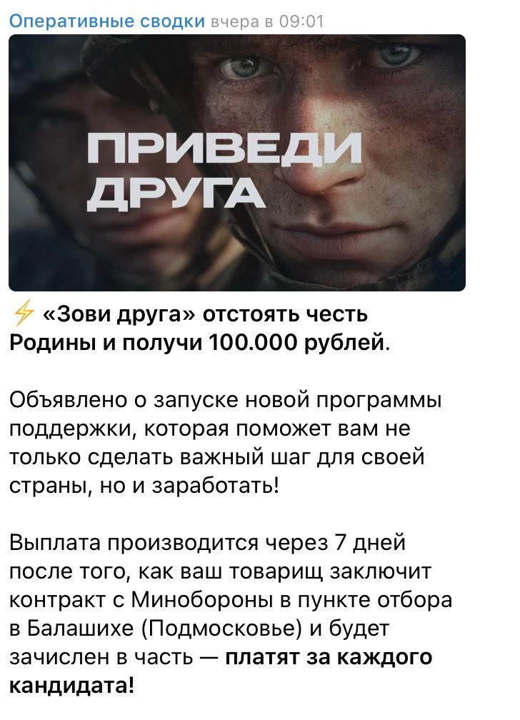 Приведешь друга – тебе 100 тысяч дадут. Друг, правда, в течение нескольких недель после попадания на фронт погибнет, но 100 тысяч это 100 тысяч.