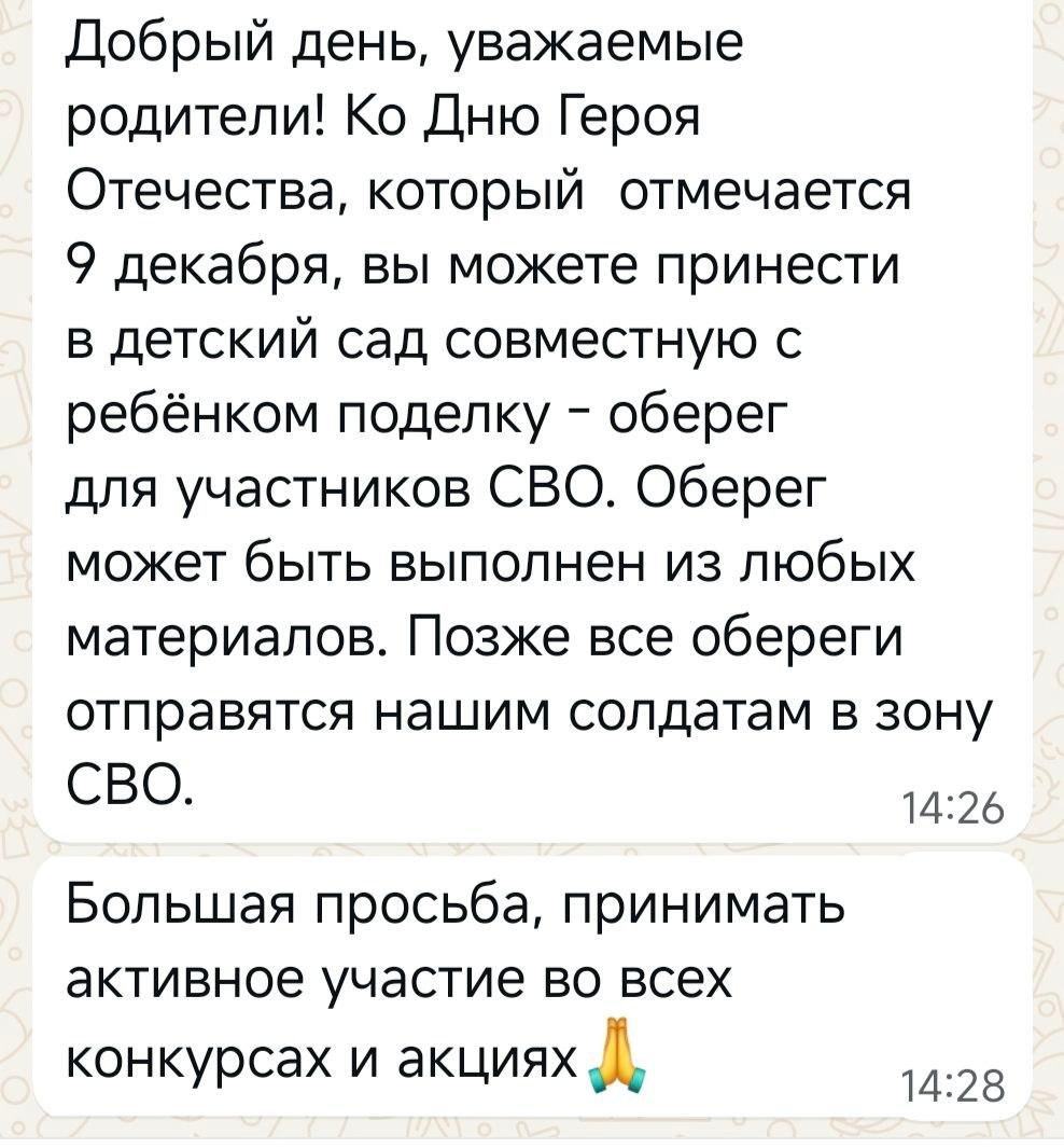 Посмотрите на это сообщение воспитателя родителям младшей группы детского сада в Екатеринбурге. У меня уже большая коллекция таких сообщений. Оно нам кажется ничем не примечательным, но все такие тексты надо анализировать – из них складывается новая российская нормальность.