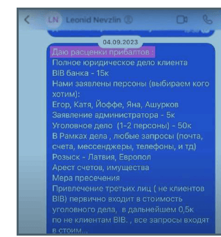 Но тут возникает наш ближневосточный бизнесмен. Согласно переписке, в сентябре 23 года Блинов пишет Невзлину расценки на возбуждение уголовного дела, где упоминает имя Ашуркова (правда, почему-то говорит о другом банке-банкроте, вероятно ошибка самого Блинова).