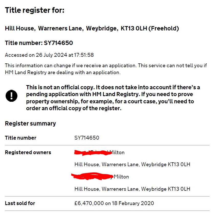Так может, Ашурков просто-напросто напиздел? Напиздюнькал? Наебал? Соврал? Сказал неправду? И тут мы обращаемся к Его Величества Земельному Реестру 18 февраля 2020 года дом за £6,47 млн купила чета Милтонов.