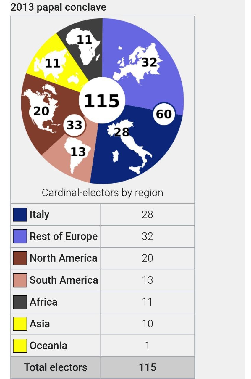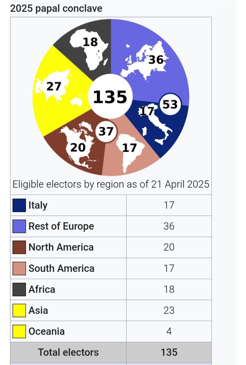 1. из 252 членов Коллегии кардиналов на момент смерти Франциска 135 кардиналов-выборщиков имеют право участвовать в последующем конклаве. Двое кардиналов-выборщиков объявили, что не будут присутствовать, что уменьшило ожидаемое число участников до 133. Чтобы быть избранным папой, кандидату требуется две трети голосов всех участвующих выборщиков, или 89 голосов.