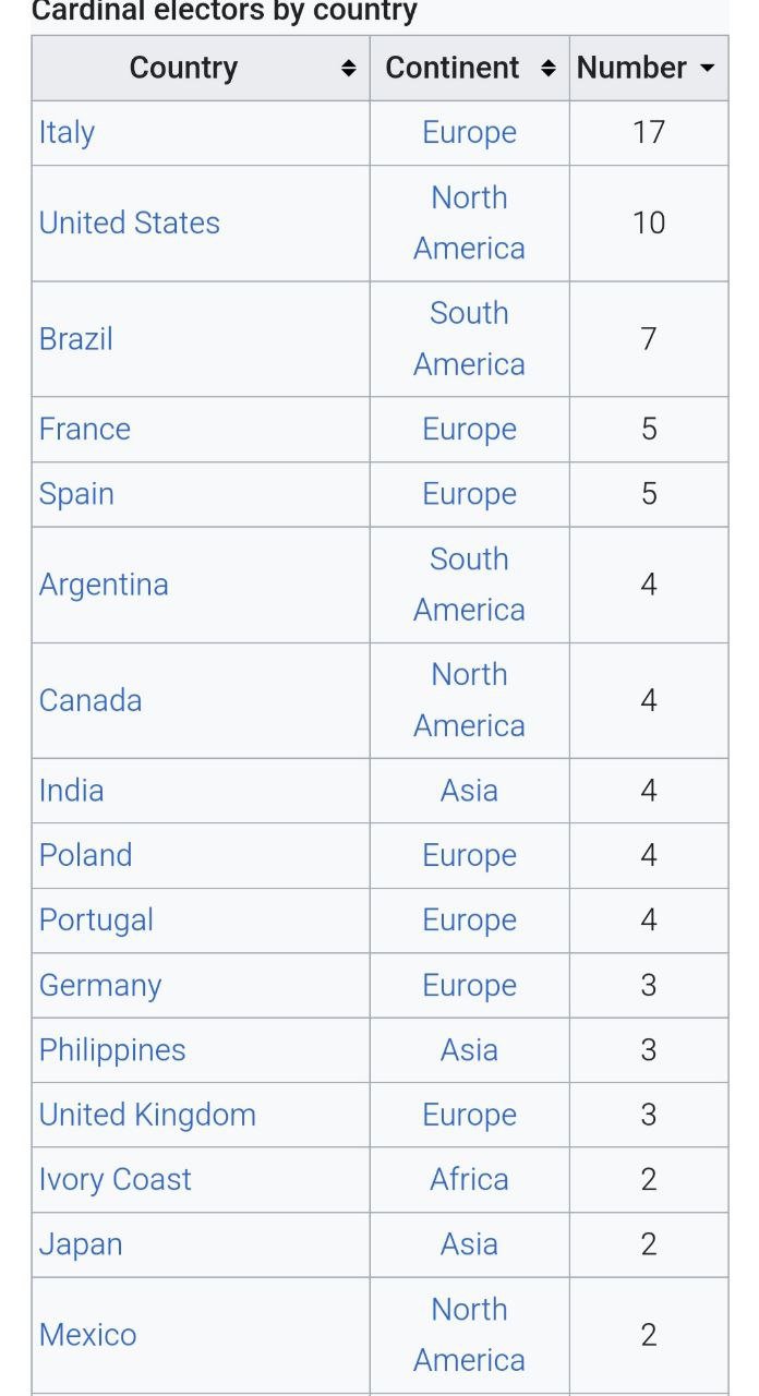 3. Главное изменение по сравнению с прошлым Конклавом (см. Таблицы): выросла доля представителей “третьего мира”, то есть мировой периферии. Это, с одной стороны, рост непредсказуемости голосования, с другой стороны, рост влияния курии, так если многие новые кардиналы не знают друг друга, то растёт роль организаторов выборов (то есть Курии). Значит, шансы кандидатов из Курии заведомо выше.