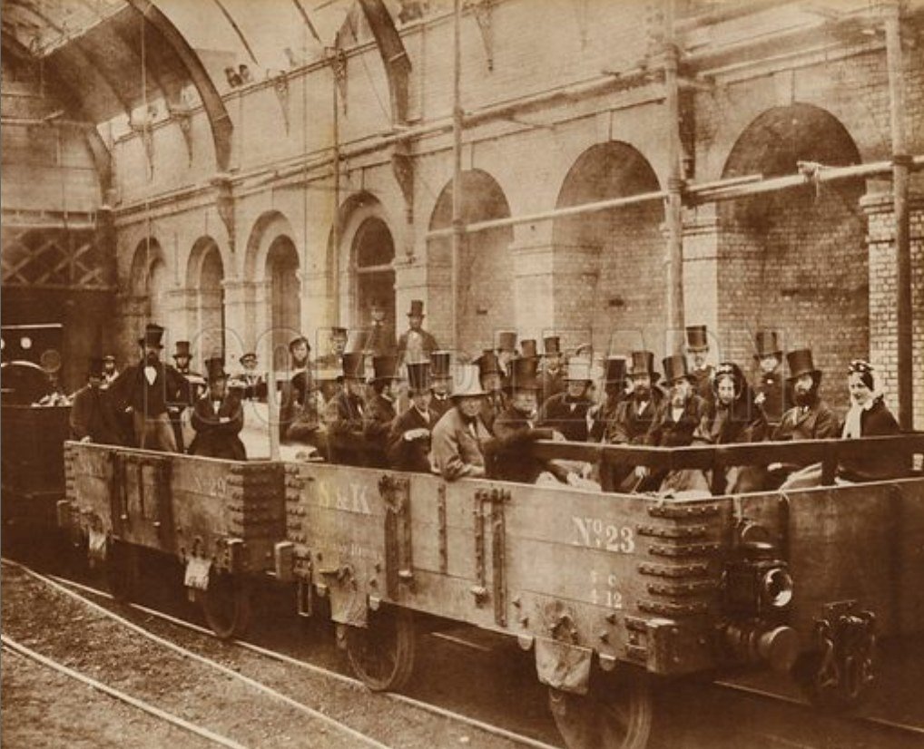 На первом снимке (Лондон, 1863 год) леди и джентльмены из высшего общества путешествуют на новом виде транспорта – Мэтро (Metropolitan Railway). Копоть, сажа и искры из локомотивной трубы, летучие мыши в туннелях им нипочем. А трясет намного меньше, чем в карете по ухабам да булыжной мостовой.