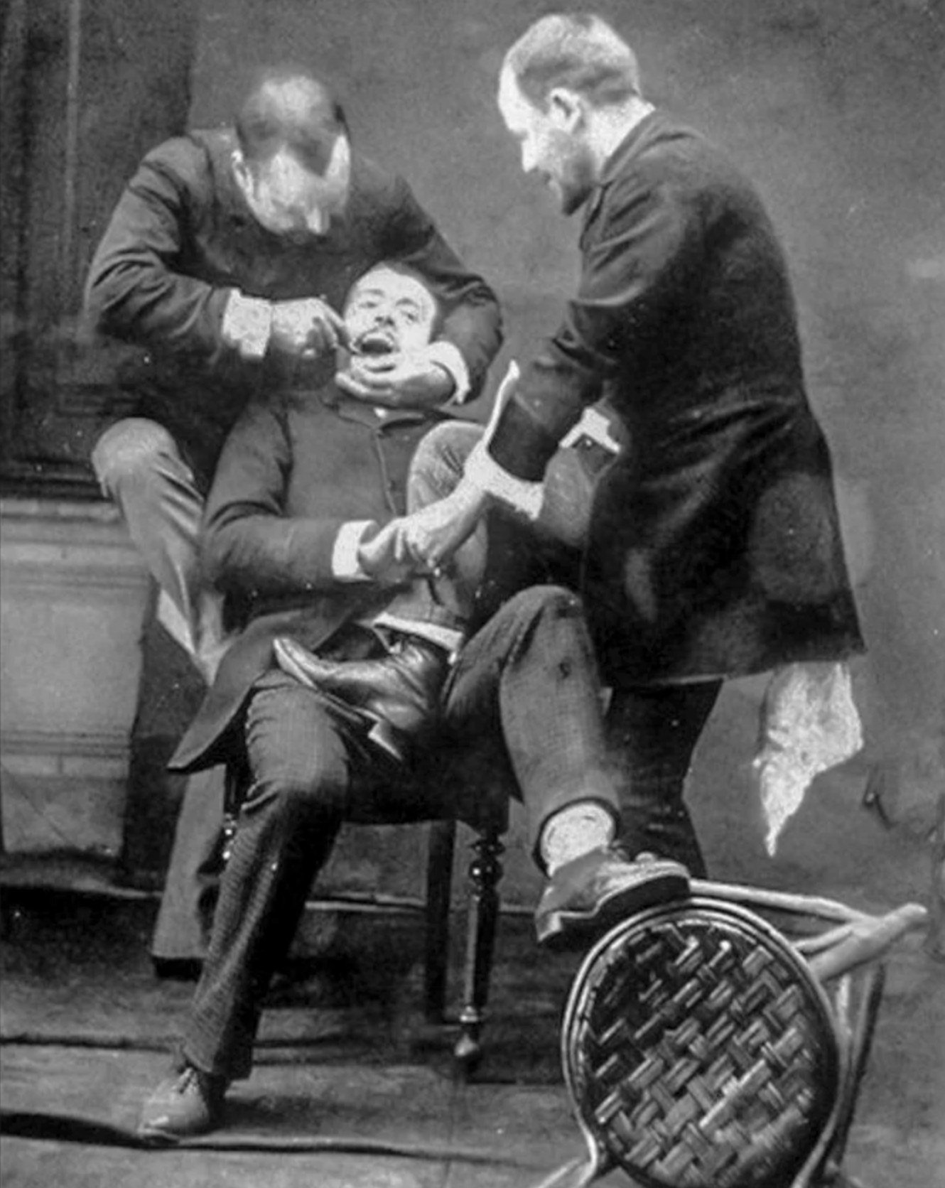На втором снимке (1892) обычная сцена в кабинете дантиста. Справа – анестезиолог.