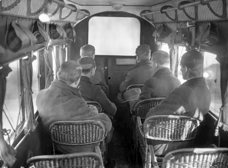 И лишь на третьем, столетней давности, мы видим зарождение настоящего комфорта. Пассажиры одного из первых коммерческих авиарейсов класса «люкс» смотрят в салоне кино, охреневая от чудес прогресса.
