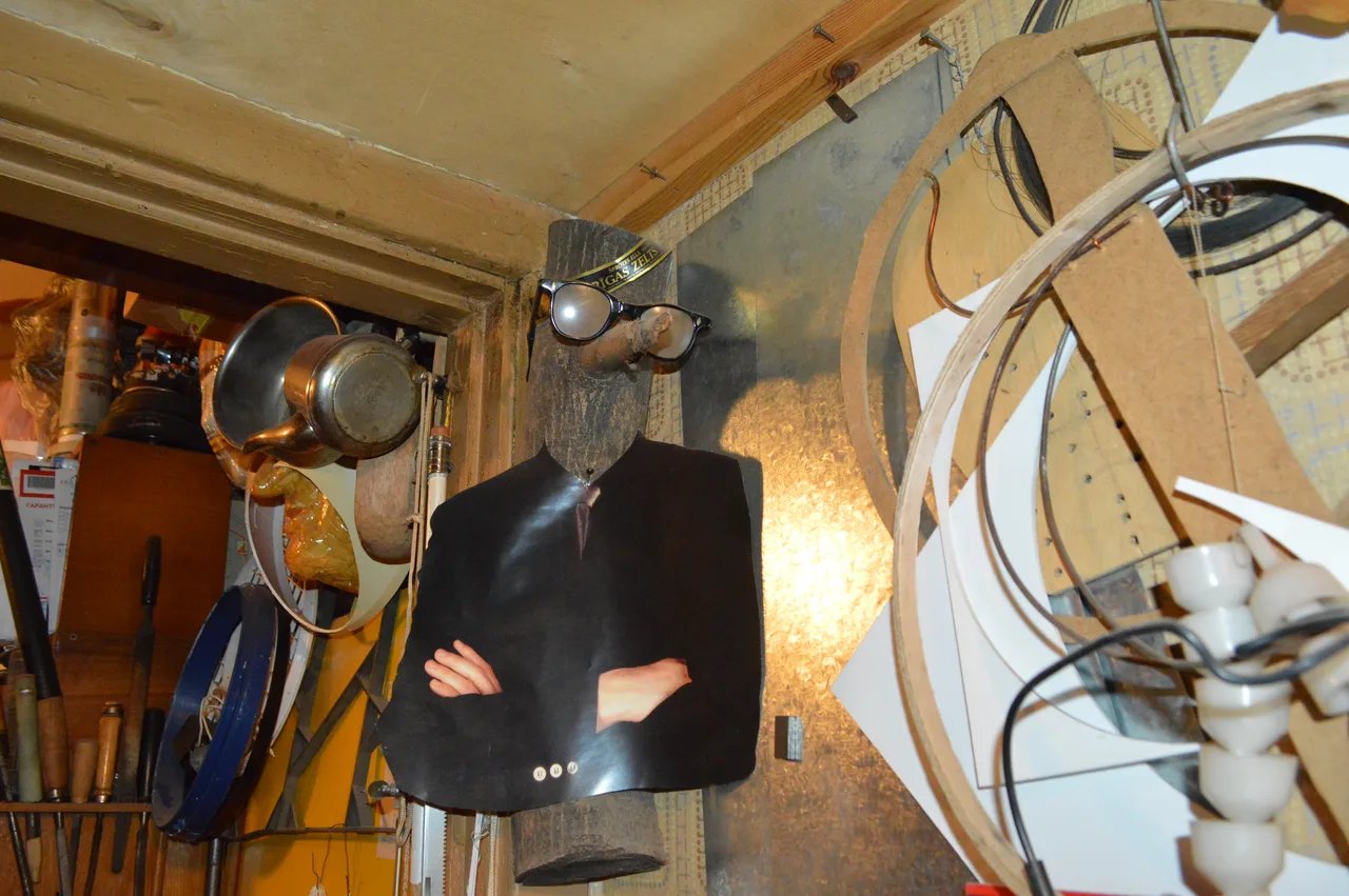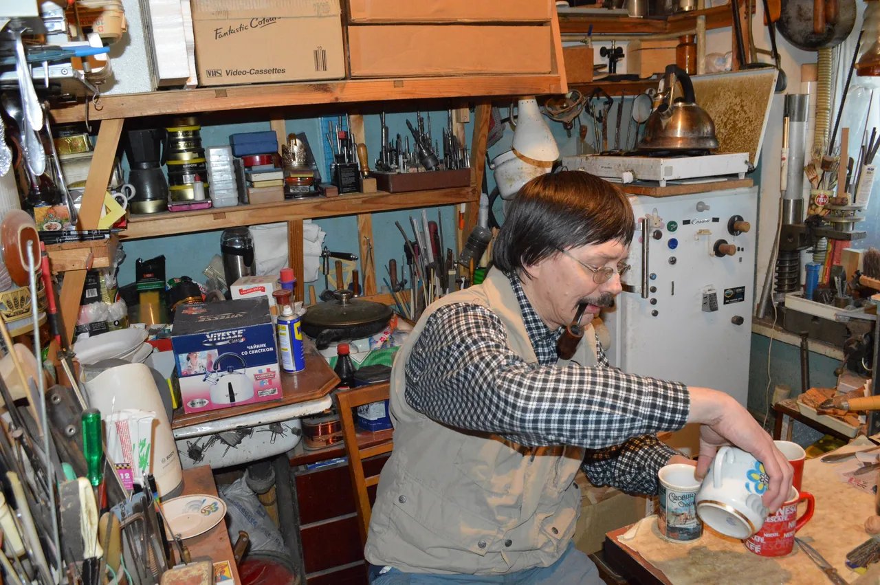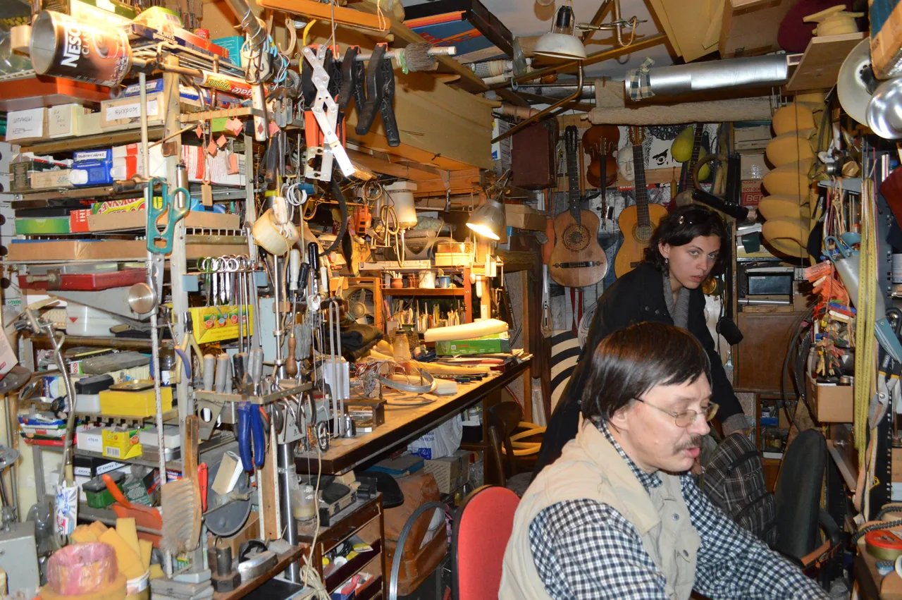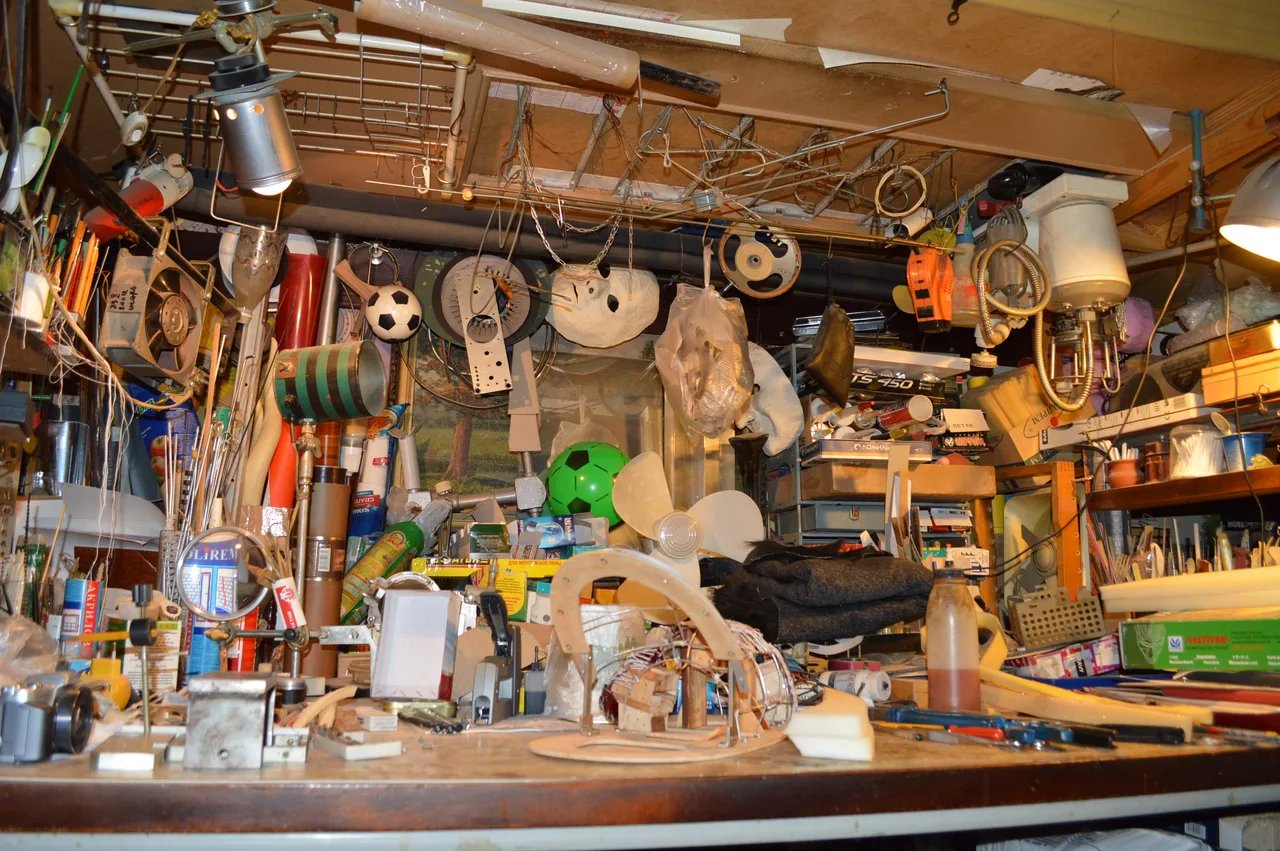 Разглядывая фотки, можно подумать, будто в квартире царил беспорядок. Но если приглядеться, ровно наоборот. Все инструменты, все материалы, вся утварь были расположены в идеальном порядке, всё имело своё место, свой гвоздик и полочку — каждый инструмент всегда был там, где нужно, под рукой хозяина.