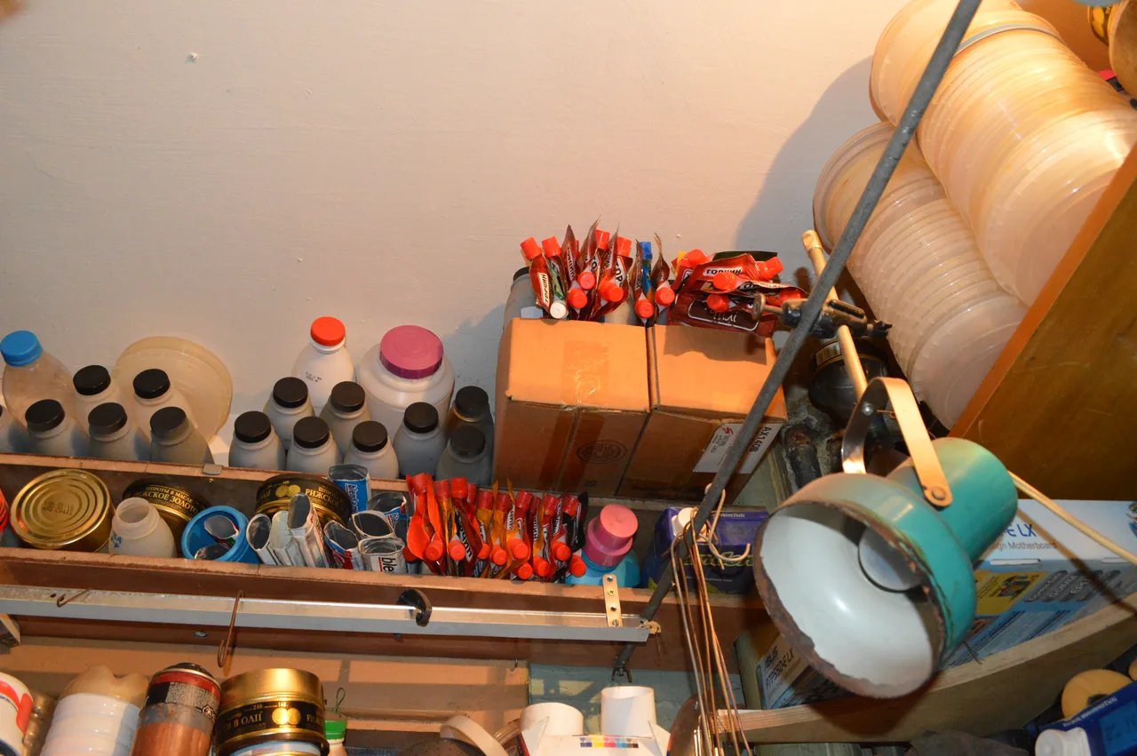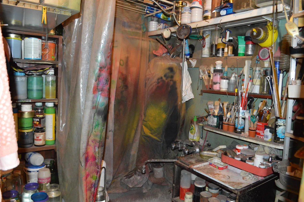 Ну и конечно в доме были краски, растворители, пульверизаторы. Самые разные, для самых разных задач. Это был целый покрасочный цех, целая красочная фабрика, потому что какой же реквизит без краски?
