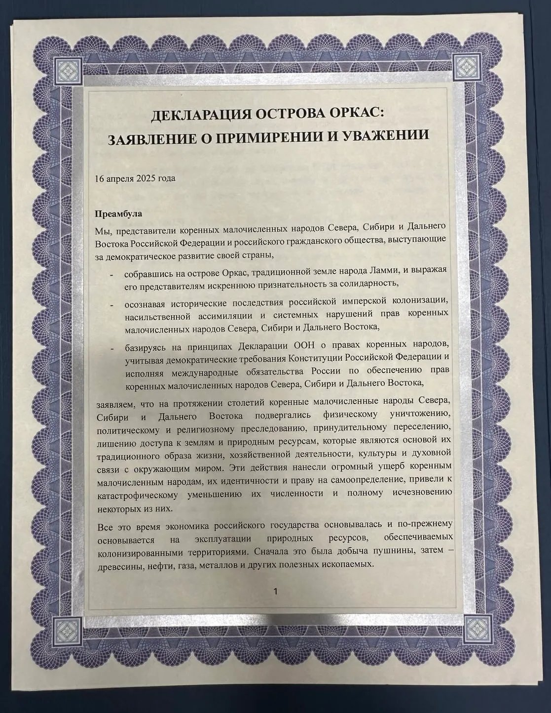 – собравшись на острове Оркас, традиционной земле народа Ламми, и выражая его представителям искреннюю признательность за солидарность,осознавая исторические последствия российской имперской колонизации, насильственной ассимиляции и системных нарушений прав коренных малочисленных народов Севера, Сибири и Дальнего Востока,