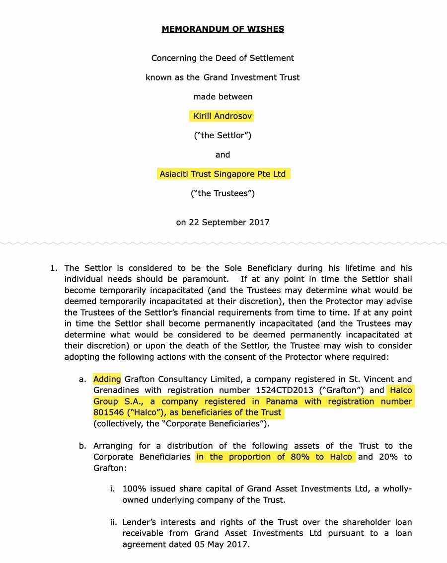 Возможно, на этот раз правду и удалось бы скрыть, если бы сингапурские власти, где действовали некоторые из компаний этой офшорной сети, не инициировали проверку AsiaCiti, по итогам которой провайдер офшорных услуг получил серьезный штраф и начал внутреннее расследование. И тут-то сотрудники AsiaCiti наткнулись на удивительный документ, который теперь есть и в распоряжении «Проекта», — это составленное осенью 2017 года завещание Кирилла Андросова. Завещатель сообщает, что в случае его смерти или недееспособности, его офшор, владеющий в том числе всем фондом Altera Capital , а также фондом Lang Capital , должен почти полностью , если быть точным, то на 80%, отойти другому офшору — Halco Group SA.