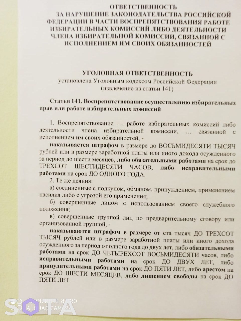 В помещениях московских УИКов стали появляться объявления с цитатами из Уголовного кодекса: так пытаются предотвратить «Полдень против Путина». Прокуратура Москвы заявила, что участие в акции будет приравнено к нарушению статьи 141 УК о препятствовании выборам. Текст именно этой статьи цитируется в объявлениях – пишет SOTA.