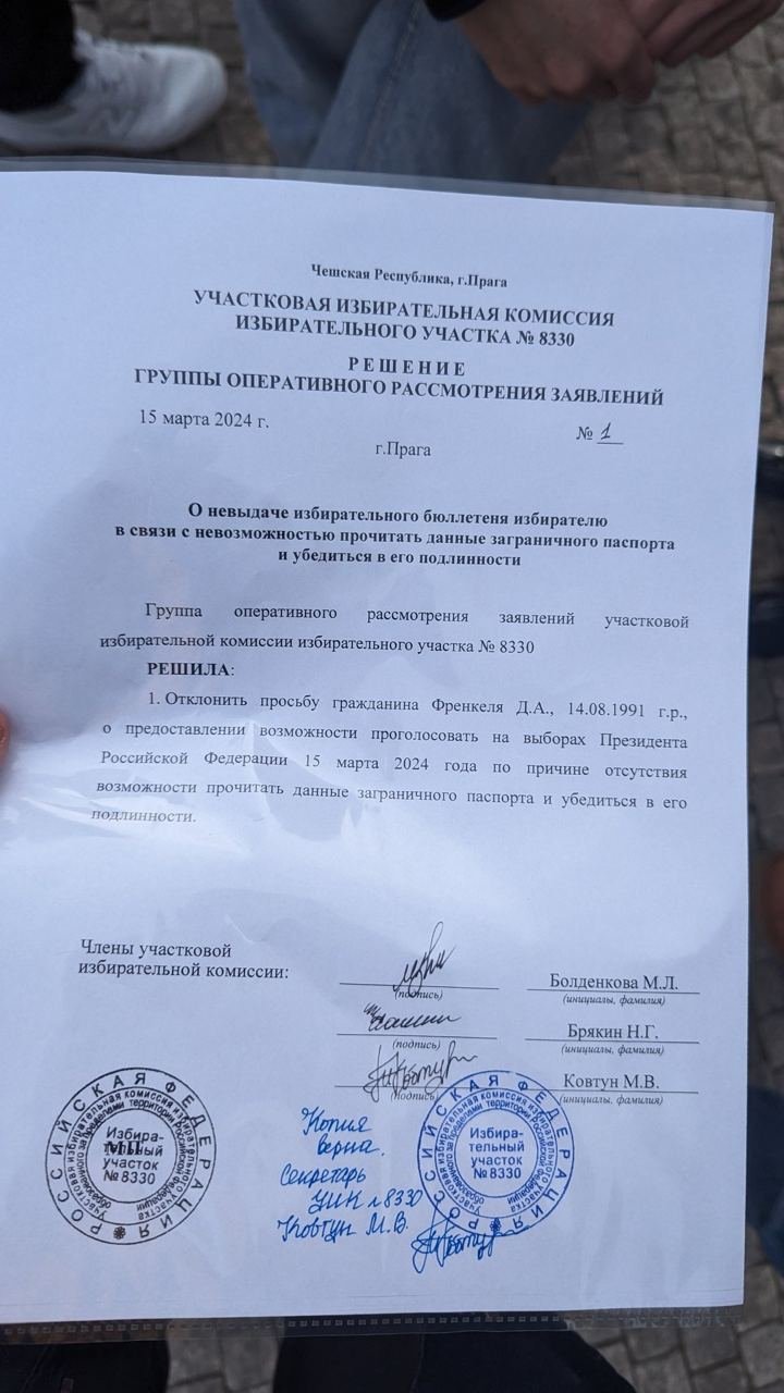 Российский избирком в Праге отказался допускать к голосованию журналиста «Медиазоны» Давида Френкеля, потому что он не отдал паспорт в руки. В отказе сказано, что комиссия не смогла «прочитать данные заграничного паспорта». При этом его ФИО и дату рождения списали с загранпаспорта, – пишет The Insider.