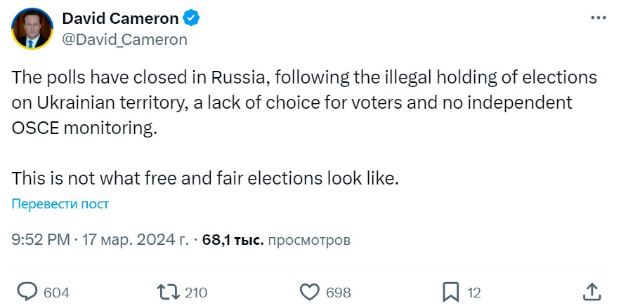 Глава МИД Великобритании Дэвид Кэмерон заявил, что выборы президента России прошли в условиях «отсутствия выбора у избирателей и независимого мониторинга со стороны ОБСЕ». Он также назвал «незаконным» проведение голосования на оккупированных территориях Украины.