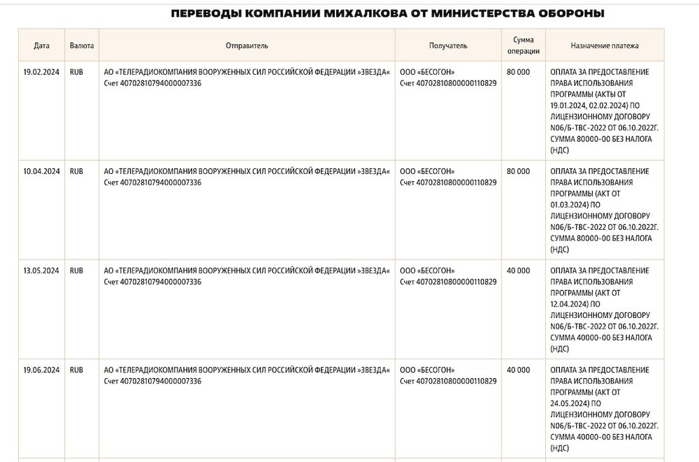 Мы выяснили, что каждый выпуск «Бесогона» оплачивает… российская государственная компания Роснефть. Как минимум с начала 2024 года Роснефть платит фирме Михалкова ровно 5 миллионов рублей за каждую передачу. Переводы маскируются под оплату размещения рекламно-информационных материалов нефтяной компании Роснефть.