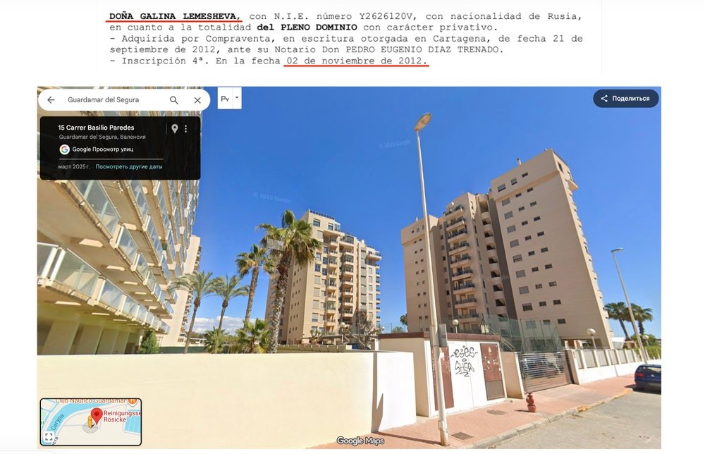 В процессе отстаивания традиционных (а скорее логистических) ценностей, Никита Сергеевич Михалков поселил свою вторую семью рядом с первой. В 20 минутах от дома в Торревьехе, где у основной семьи Михалковых куплены 3 квартиры, мы обнаружили квартиру любовницы Михалкова. Мария Лемешева (по паспорту она Галина) стала собственницей 115-метровых апартаментов в 2012 году — через год после рождения дочери.