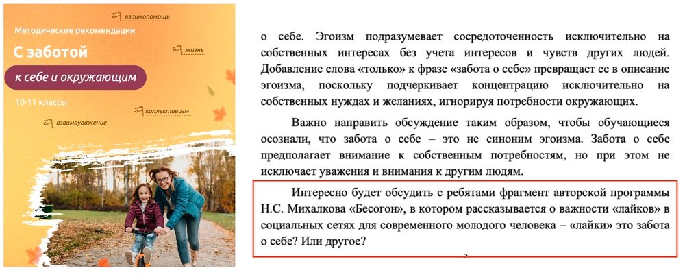 Смотрим еще одну методичку: следующий Разговор о важном, на обложке золотая осень и почему-то коллективизм, тема — с заботой к себе и окружающих. Снова учитель говорит, что нужно посмотреть отрывок из передачи Михалкова… и включает кусочек выпуска «Бесогона» десятилетней давности.