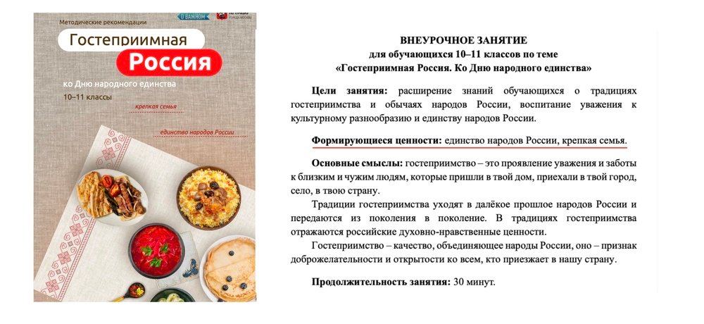 Разберем одну из методичек, чем-то похожую на меню ресторана. На этом «уроке о важном» старшеклассников учат традициям гостеприимства и обычаям народов России. Есть список ценностей, которые надо у школьников сформировать: единство народов России и крепкая семья.