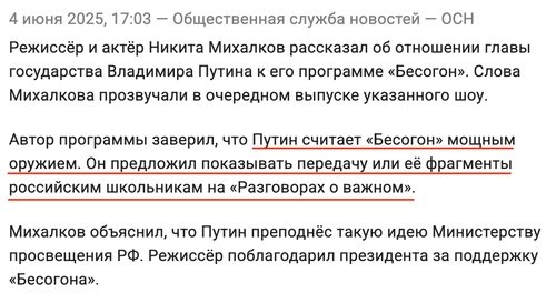 По словам самого Михалкова, Путин как-то сказал ему, что «Бесогон» — это очень «мощно оружие.