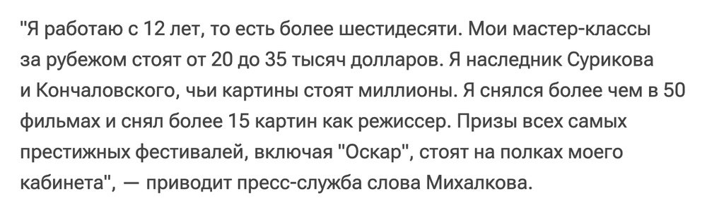 Разгорелся скандал и Михалкову пришлось оправдываться — было сказано, что он успешный режиссер, удачливый инвестор и вообще наследник Сурикова и Кончаловского, чьи картины стоят миллионы. Недоразумение уладили и больше доходы Михалкова никогда не раскрывались, но и этого одного документа нам хватит.