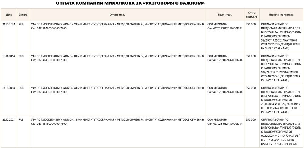 За каждый такой мини-кусочек, показанный на уроках в школе, Михалков получает 350 000 рублей. За два месяца 2024 года в «Разговорах о важном» показали 4 таких фрагмента. И на счёт фирмы Михалкова, ООО «Бесогон», поступили, соответственно, 1 миллион 400 тысяч рублей.