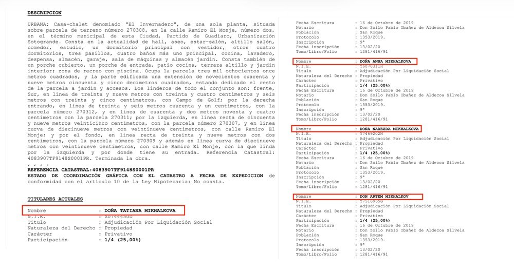 Эта вилла смогла избежать ареста, потому что Михалков оформил её не на себя, как аппартаменты в спа-клинике, а на своих близких — на жену Татьяну и детей — Анну, Надежду и Артема Михалковых. Они, вопреки патриотичным речам главы семейства, избавляться от этой роскошной испанской виллы за 5 миллионов евро не спешат.